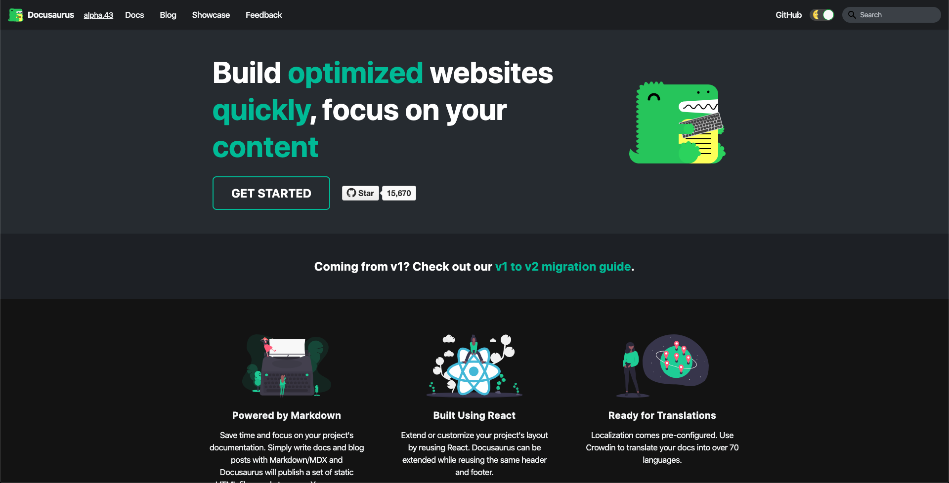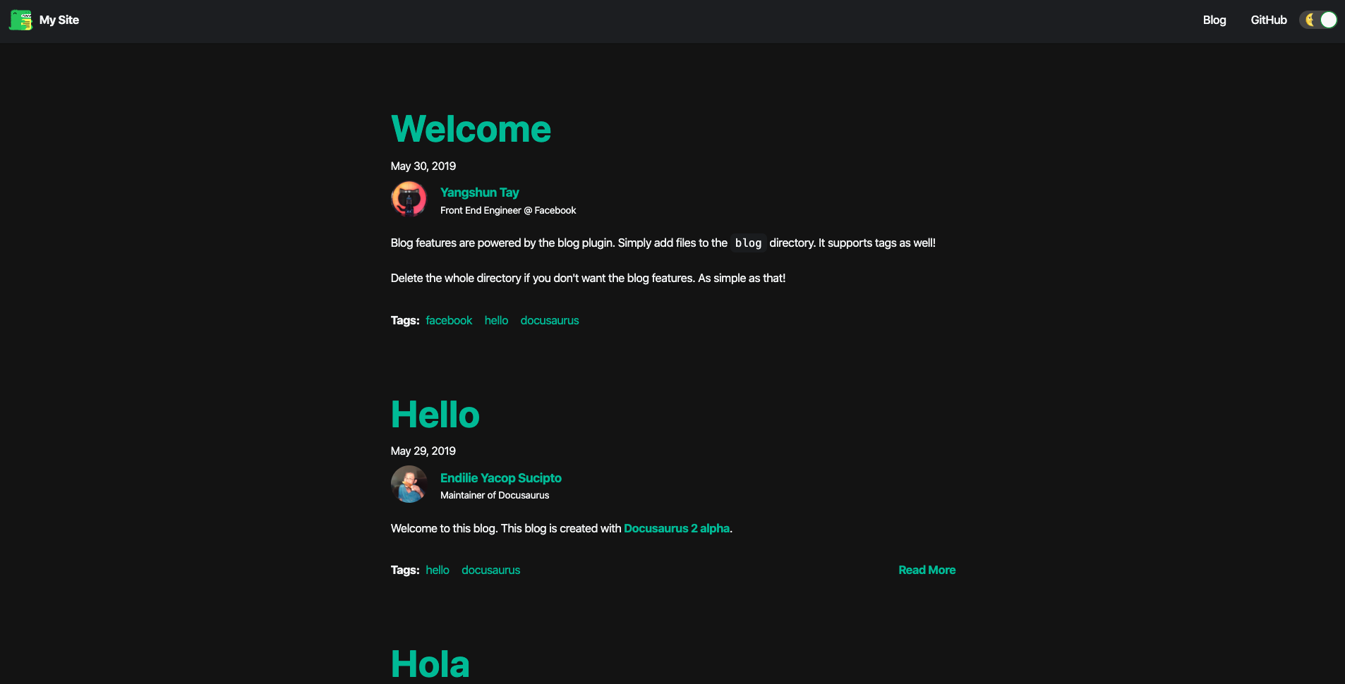 我以前总也找不到一个满意的博客系统,wordpress 这个程序又大,然后配置也不方便。占用的服务器的资源也多。我就想有没有一个又简单又快速的博客平台,后来发现了一些静态的网站生成器,像 hexo 这种,但是发现上面的主题又不好看,又懒得自己去写。后来就有一阵子我就直接把博客就发布在了其他的第三方的博客平台上。现在发现了这个 docusaurus, 它的主题跟我之前看到的一个大佬 Dan Abramov,它的 overreacted.io 博客,风格是一模一样的,因为他是 react 的作者之一,估计这个他们这个样式都是互相借鉴,它这个主题可以切换暗黑和白天模式,比较好看。安装和部署也特别简单,我的博客也是用它这个搭建的。